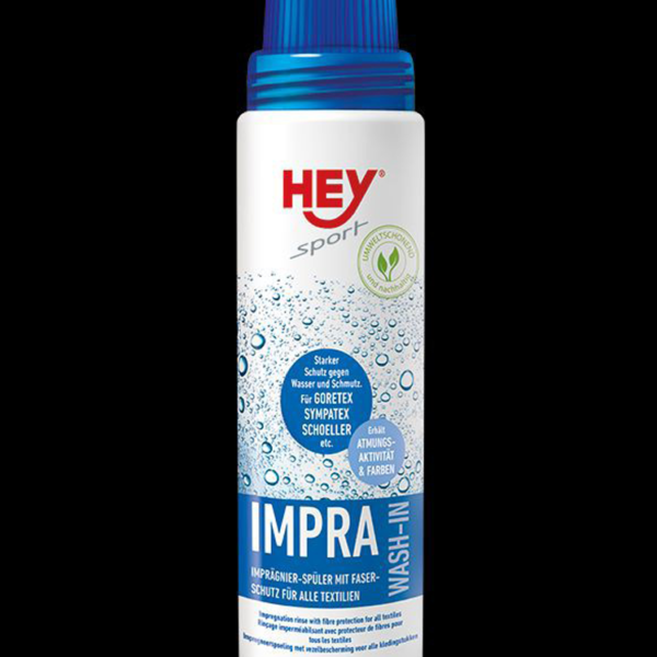 Preparat HEY IMPRA - WASH do prania odzieży tekstylnej. Okala włókna nie tworząc zamkniętej powłoki, umożliwiając tym samym "oddychanie" tkaniny. Pojemność: 250ml.