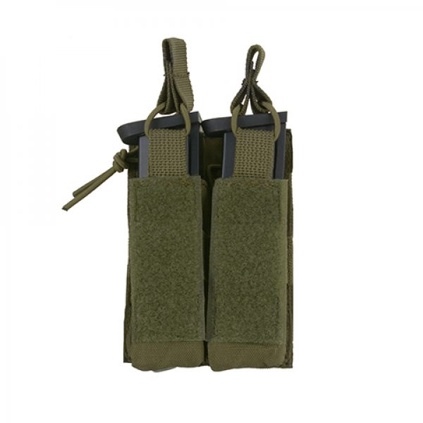 Ta otwarta podwójna ładownica jest w pełni kompatybilna z systemem Molle.Została wykonana z bardzo lekkiego, wytrzymałego i wodoodpornego materiału. Dodatkowo każda z kieszeni została wyposażona w otwór odprowadzania wody z oczkiem pod kolor.Dodatkowo wszyte gumowe pasy zapewniają pewne trzymanie magazynka.Gumowa linka na gorze jest w pełni regulowana, dzięki czemu zabezpieczy magazynek o różnej długości.Ładownica z łatwością pomieści magazynek, latarkę, nóż i inne wyposażenie.Na zewnętrznej stronie kieszeni znajdują się rzep który umożliwia mocowanie dodatkowego wyposażenia wykorzystującego ten system lub po prostu przyczepienie naszywki.