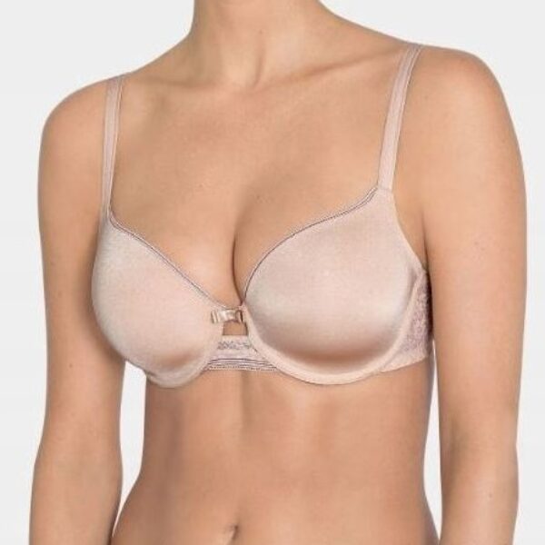 Biustonosz usztywniany na fiszbinach. Miseczki o pełniejszym fasonie wykończone delikatną lamówką. Wykonane z gładkiej tkaniny dzięki czemu nie odznaczają się pod ubraniem. W modelu zastosowano fiszbiny 3D, które lepiej podtrzymują pełniejszy biust, są elastyczne i dostosowują się do ruchu ciała.Skład: 53% Poliamid, 32% Poliester, 15% Elastan