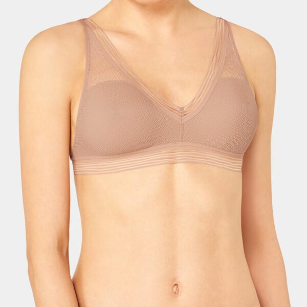 Miękki, komfortowy biustonosz bez fiszbin, model z wyżej zabudowanymi miseczkami, które pokryte delikatną siateczką nadają serii nowoczesny design. Od wewnątrz miseczki pokryte gładką miękką tkaniną, obwód i brzegi miseczek wykończone płaską i delikatną gumeczką. Skład: 82% poliamid, 18% Elastan