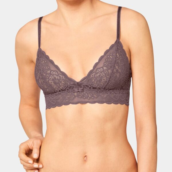Miękki , koronkowy biustonosz bez fiszbin. Uwodzicielski i zmysłowy model uszyty z wysokiej jakości, delikatnej, transparentnej koronki. Model posiada koronkowe wykończenie pod biustem, miękko okalające sylwetkę.Skład:86% Poliamid, 14% Elastan
