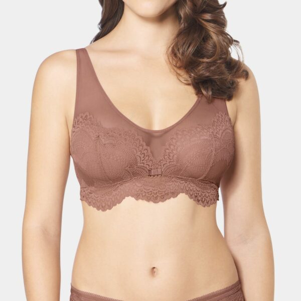 Miękki biustonosz na fiszbinach typu bralette. Uszyty z delikatnego tiulu z dodatkiem koronki, szerokie ramiączka oraz wszyta koronkowa taśma pod biustem gwarantują idealne dopasowanie i komfort noszenia. Model posiada elastyczne boczne fiszbiny, zaokrąglony dekolt wykonany z delikatnego tiulu. Model dostępny do miseczki "G" .Skład:90% poliamid, 10% Elastan