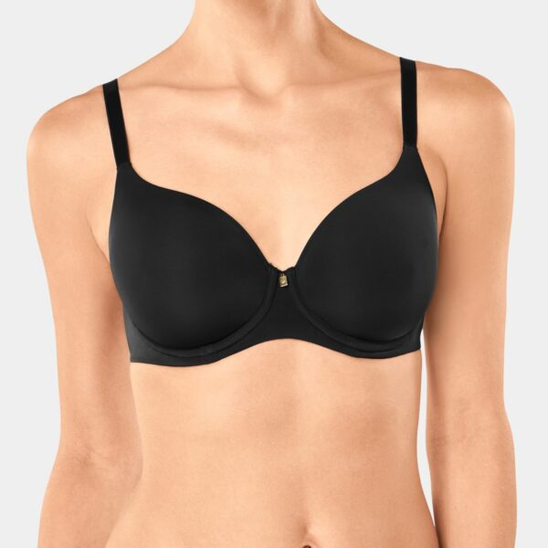 Gładki, zabudowany biustonosz z lekko usztywnionymi miseczkami na fiszbinach. Wykonany z miękkiego, przyjemnego dla ciała materiału. Miseczki wykonane technologią Spacer Cup, lekkie i posiadają właściwości oddychające. Biustonosz wykończony bezszwowo co gwarantuje idealne dopasowanie i nie odznaczanie się pod ubraniem. Między miseczkami subtelny złoty branding dodający elegancji.Skład:40% Poliamid, 45% Poliester, 15% Elastan.