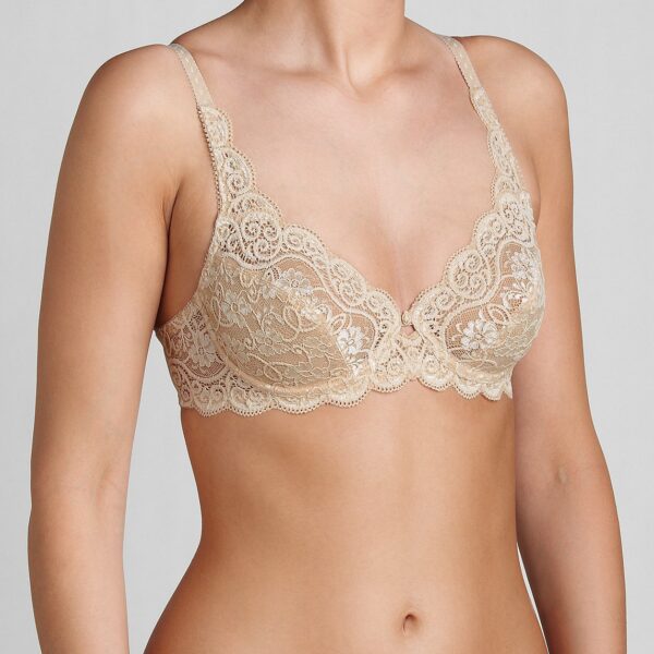 Miękki biustonosz na fiszbinach, w całości wykonany z eleganckiej koronki z motywem kwiatowym. Koronka zdobi również delikatnie poszerzane z przodu ramiączka. Model zapewnia stabilne podtrzymanie biustu oraz komfort użytkowania. Skład:68% Poliamid, 18% Elastan, 14% Viskoza