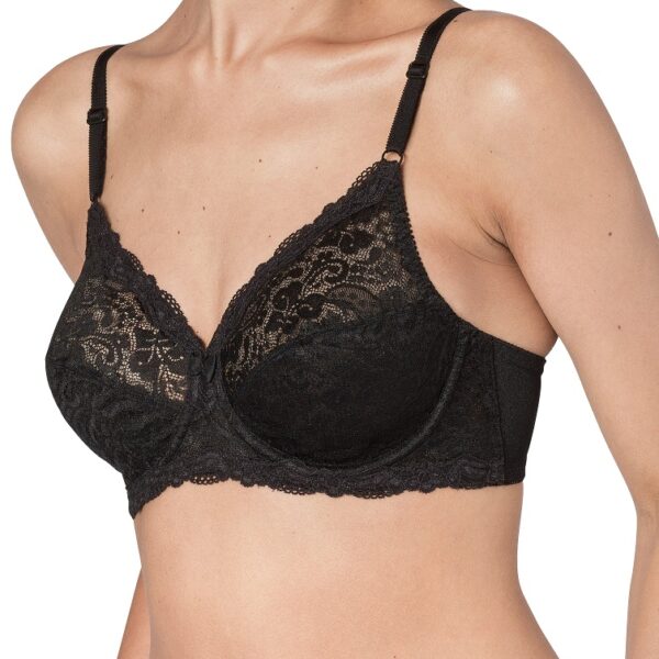 Mocno zabudowany biustonosz z miękkimi miseczkami na fiszbinach. Miseczki wykonane w całości z koronki, w dolnej części wzmocnione dodatkową warstwą tiulu. Model dostępny również w większych rozmiarach.Skład:90% poliamid, 10% elastan.