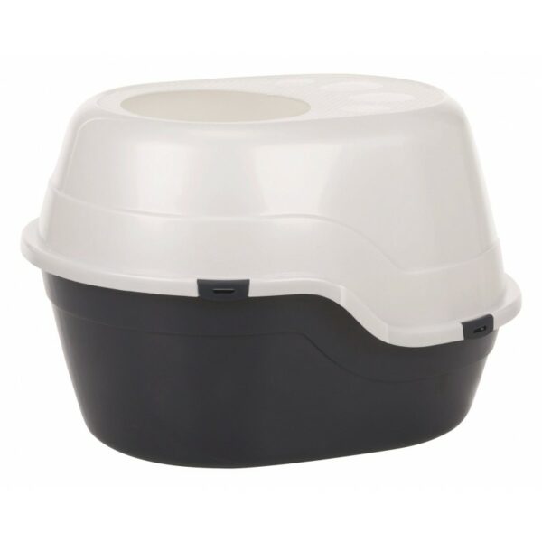 Trixie Luiz Top Entry to wyjątkowa kuweta z wejściem ‘od góry’ zaprojektowana, by zapobiegać wysypywaniu żwirku na podłogę!Kuweta z wejściem od góry to niewątpliwa zaleta z kilku powodów:- oszczędność miejsca w domu - dzięki wejściu od góry - nie ma znaczenia gdzie kuweta stoi - czy w rogu mieszkania, czy pomiędzy meblami, czy pod stołem ani w którą stronę jest umiejscowiona - kot zawsze będzie miał do niej dostęp, nawet jeśli z każdej strony będzie zastawiona.- pomaga zachować czystość - górna pokrywa stanowi wycieraczkę - która wyłapuje żwirek z kocich łapek. Dzięki temu nie musimy stosować dodatkowej wycieraczki przed kuwetą i rzadziej musimy zamiatać. Jeśli ustawimy ją tak, aby otwór wejściowy był przy ścianie - zmniejszamy możliwości gwałtownego wyskakiwania z kuwety w losowych kierunkach.- żwirek wynoszony na łapkach kota zostaje w kuwecie zamiast roznosić się po domu - kuweta z wejściem od góry znacząco zmniejsza ilość rozsypywanego żwirku - nie ma możliwości wykopania przez kota żwirku na zewnątrz, a konieczność wskakiwania na pokrywkę, która również stanowi dużą wycieraczkę zapewni, że mniej żwirku przyczepi się do łap kota. Koty nawet wyskakując z takiej kuwety z dużym impetem - nie będą rozsypywać żwirku przez otwór wejściowy, w przeciwieństwie do kuwet krytych czy otwartych.- zmniejszona ilość pyłu - kiedy kot kopie wewnątrz tradycyjnej kuwety, zwykle unosi się pył ze żwirku i wydostaje na zewnątrz kuwety - osadzając na podłodze czy pobliskich meblach. Kuweta z wejściem od góry zatrzymuje większość pyłu wewnątrz, co zwiększa czystość.- zapewnia higienę oraz chroni przed dziećmi i psami - kuwety z dostępem od góry eliminują również problemy z psami oraz małymi dziećmi. Dzięki wejściu z góry - ani małe, ani duże rasy psów nie mogą dostać się do wnętrza kuwety, co zapobiega zjadaniu odchodów. Małe dzieci nie mogą sięgnąć do kuwety co chroni je przed bakteriami z odchodów. Tylko kot może łatwo wchodzić do środka.- szerokie wejście o średnicy 23 cm jest odpowiednie dla kotów różnej wielkościWymiary:- 63 cm x 49 cm x 42 cm - odpowiednie dla wszystkich kotów i kociąt, włącznie z większymi rasami (Maine Coon, Ragdoll powyżej 10kg)- wymiary wewnątrz: ok. 60 x 41 x 38 cm- średnica otworu wejściowego: ok. 23 cm- wysokość dolnej misy przód/tył : ok. 17 cm / ok. 25 cmKolor: granatowy spód, biała pokrywa.