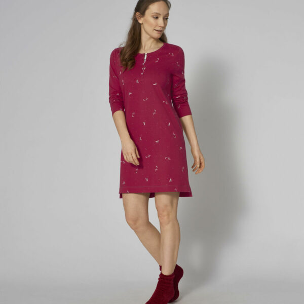 Koszula nocna z serii Lounge-Me Cotton dzięki wykonaniu z miękkiego i ciepłego jerseyu bawełnianego jest wyjątkowo wygodna i idealnie sprawdzi się podczas chłodniejszych, jesiennych wieczorów.Luźny, prosty krój do kolan z długimi rękawamiPlisa pod szyją z małymi guzikami z masy perłowejCałkowita długość rozmiaru 38: 95 cmTkanina z kolorowym nadrukiem i nieliczne połyskującymi kropeczkamiMasę perłową pozyskuje się z wnętrza muszli. Masa perłowa jest produktem pochodzenia zwierzęcego i jesteśmy zobowiązani do złożenia niniejszej deklaracji: produkt zawiera nietekstylne elementy pochodzenia zwierzęcego