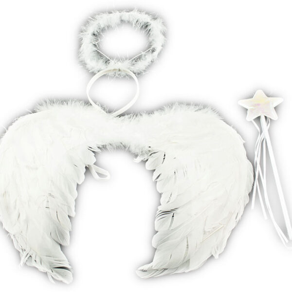 Skrzydła aniołka + aureolka i różdżka Skrzydełka aniołka wraz z różdżką i aureolą.Skrzydełka wynokane są z prawdziwych, białych piór przyklejonych do sztywnego, białego kartonu.Dodatkowo skrzydełka zostały wyposażone w gumeczki, dzięki czemu dziecko, bez trudu je założy.Aureola jest w postaci opaski o uniwersalnym rozmiarze.Dodatkowo do zestawu dołaczono białą różdżkę owiniętą wstążką.Zestwa dosnkonale sprawdzi się podczas balu karnnawałowego lub przedstawienia.Wymiary: Skrzydełka: 45x30cm. Długość różdżki: 35cm. Wzór różdzki: serce
