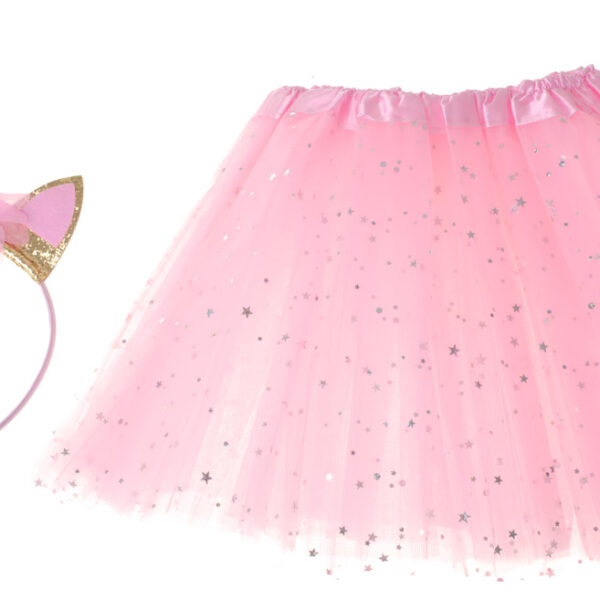 Strój karnawałowy opaska jednorożca i różowa spódniczka księżniczki pokryta błyszczącymi gwiazdkami. Czy istnieje bardziej czarodziejskie połączenie?Ulubiony krój spódniczki - baletnicy to marzenie każdej małej księżniczki.Spódniczka wykonana z poliestru, w pasie posiada wszytą rozciągliwą gumkę przez co bez trudu można dopasować ją do rozmiaru dziecka. Cała pokryta jest cekinami w kształcie gwiazdek - na żywo prezentuje się porywająco.Plastikowa opaska obszyta jest różową, połyskującą tkaniną i ozdobiona rogiem z miękkiego tworzywa i cekinowymi uszami. Czy już widzisz ten uśmiech zadowolenia na twarzy dziecka?Doskonały pomysł na prezent dla każdej małej księżniczki!Strój karnawałowy idealnie sprawdzi się jako przebranie dla malucha na różnego rodzaju imprezy karnawałowe, bale przebierańców, urodzinowe przyjęcia lub do codziennej zabawy.Zabawa w przebieranie się i odgrywanie różnych ról społecznych to nieodzowny element dzieciństwa.Dzieci chętnie wcielają się różne postacie i odgrywają scenki. Kostium pomoże w 100% wczuć się w rolę księżniczki lub czarodziejki.Zestaw z pewnością przyniesie mnóstwo zabawy i radości dziecku.W tym niepowtarzalnym przebraniu dziecko poczuje się wyjątkowo i wzbudzi zainteresowanie swoich rówieśników. Kostium może być wykorzystywany w celach prywatnych i komercyjnych. Zestaw świetnie sprawdzi się podczas występów teatralnych czy też sesji zdjęciowych. Strój można wykorzystywać do codziennej zabawy dziecka dzięki której: rozwinie kreatywność oraz wesprze rozwój intelektualny, rozwinie dziecięcą wyobraźnię, pozwoli doskonalić umiejętności społeczne oraz poznać jak zachować się w różnych sytuacjach, wzbogaci słownictwo dziecka, nauczy wyrażania emocji, empatiioraz rozwinie inteligencję emocjonalną, podczas zabawy z inny dziećmi świetnie nauczy pracyw grupie.Długość całkowita spódniczki: 30cmKolor: RóżowyMateriał: PoliesterWiek: 3-6latProdukt fabrycznie nowy, zapakowany w oryginalne opakowanie.