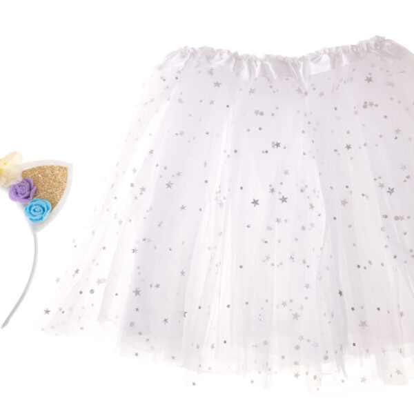 STRÓJ KARNAWAŁOWY JEDNOROŻECStrój karnawałowy opaska jednorożca i biała spódniczka księżniczki pokryta błyszczącymi gwiazdkami. Czy istnieje bardziej czarodziejskie połączenie?Ulubiony krój spódniczki - baletnicy to marzenie każdej małej księżniczki.Spódniczka wykonana z poliestru, w pasie posiada wszytą rozciągliwą gumkę przez co bez trudu można dopasować ją do rozmiaru dziecka. Cała pokryta jest cekinami w kształcie gwiazdek - na żywo prezentuje się porywająco.Plastikowa opaska obszyta jest różową, połyskującą tkaniną i ozdobiona rogiem z miękkiego tworzywa i cekinowymi uszami. Czy już widzisz ten uśmiech zadowolenia na twarzy dziecka?Doskonały pomysł na prezent dla każdej małej księżniczki!Strój karnawałowy idealnie sprawdzi się jako przebranie dla malucha na różnego rodzaju imprezy karnawałowe, bale przebierańców, urodzinowe przyjęcia lub do codziennej zabawy.Zabawa w przebieranie się i odgrywanie różnych ról społecznych to nieodzowny element dzieciństwa.Dzieci chętnie wcielają się różne postacie i odgrywają scenki. Kostium pomoże w 100% wczuć się w rolę księżniczki lub czarodziejki.Zestaw z pewnością przyniesie mnóstwo zabawy i radości dziecku.W tym niepowtarzalnym przebraniu dziecko poczuje się wyjątkowo i wzbudzi zainteresowanie swoich rówieśników. Kostium może być wykorzystywany w celach prywatnych i komercyjnych. Zestaw świetnie sprawdzi się podczas występów teatralnych czy też sesji zdjęciowych. Strój można wykorzystywać do codziennej zabawy dziecka dzięki której: rozwinie kreatywność oraz wesprze rozwój intelektualny, rozwinie dziecięcą wyobraźnię, pozwoli doskonalić umiejętności społeczne oraz poznać jak zachować się w różnych sytuacjach, wzbogaci słownictwo dziecka, nauczy wyrażania emocji, empatiioraz rozwinie inteligencję emocjonalną, podczas zabawy z inny dziećmi świetnie nauczy pracyw grupie.Długość całkowita spódniczki: 30cmKolor: BiałyMateriał: PoliesterWiek: 3-6latProdukt fabrycznie nowy, zapakowany w oryginalne opakowanie.