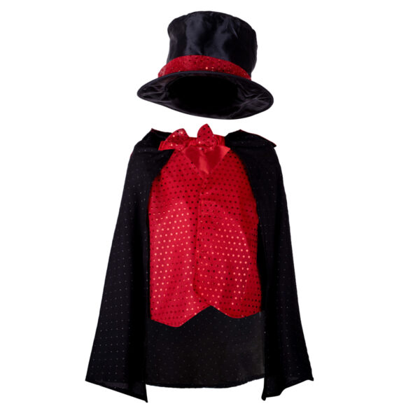Strój Karnawałowy MAGIK CZARODZIEJFantastyczne wieloczęściowe przebranie, które pozwoli każdemu dziecku poczuć się jak Magik Czarodziej. Doskonały pomysł na prezent dla przyszłego Magika.Strój Karnawałowy idealnie sprawdzi się jako przebranie dla malucha na różnego rodzaju imprezy karnawałowe, bale przebierańców, urodzinowe przyjęcia lub do codziennej zabawy. Zabawa w przebieranie się i odgrywanie różnych ról społecznych to nieodzowny element dzieciństwa. Dzieci chętnie wcielają się różne postacie i odgrywają scenki. Kostium pomoże w 100% poczuć się jak prawdziwy Czarodziej. Zestaw z pewnością przyniesie mnóstwo zabawy i radości dla każdego dziecka.W tym niepowtarzalnym przebraniu każde dziecko poczuje się wyjatkowo i wzbudzi zazdrość swoich rówieśników. Kostium może być wykorzystywany w celach prywantnych i komercyjnych. Zestaw świetnie sparwdzi się podczas występów teatralnych czy też sesji zdjęciowych. Kostium nadaje się zarówno dla dziewczynki jak i chłopca. Strój składa się z:- czerwonej brokatowej kamizelki z zapięciem na rzepy,- czarnej peleryny zakończonej brokatową muszką,- kapelusza ze specjalną skrytką w dnie,- królika (do schowania w kapeluszu),- magicznej różdżki,- monety,- instrukcji w języku angielskim z przykładowymi sztuczkami. Strój można wykorzystywać do codziennej zabawy dziecka dzięki której:- rozwinie kreatywność poprzez zabawę w odgrywanie ról,- dziecko wcieli się w różne role i będzie mogło trenować i rozwijać wyobraźnię,- nauczy się współpracować z innymi oraz ćwiczyć komunikację i pracę w grupie,- poprzez wystąpienia przed publicznością zwiększy swoją pewność siebie. Wymiary stroju mierzone na płasko:- całkowita długość peleryny 54cm,- całkowita długość kamizelki ok 35cm,- całkowita szerokość kamizelki ( pod pachami ) 36 cm,- całkowita średnica kapelusza 28 cm,- średnica otworu na głowę w kapeluszu 17 cm. Strój zapakowany w foliowe opakowanie na zatrzaski, które ułatwi przechowywanie. Idealny rozmiar dla dzieci od 3 do 8 lat.