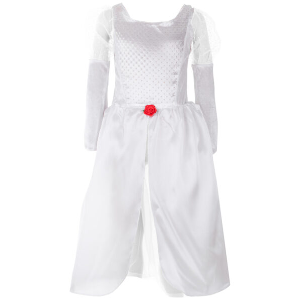 Strój Karnawałowy PANNA MŁODA Fantastyczne przebranie, które pozwoli każdej dziewczynce poczuć się jak prawdziwa Panna Młoda.Doskonały pomysł na prezent dla każdej dziewczynki.Strój Karnawałowy idealnie sprawdzi się jako przebranie dla malucha na różnego rodzaju imprezy karnawałowe, bale przebierańców, urodzinowe przyjęcia lub do codziennej zabawy.Zabawa w przebieranie się i odgrywanie różnych ról społecznych to nieodzowny element dzieciństwa.Dzieci chętnie wcielają się różne postacie i odgrywają scenki. Kostium pomoże w 100% wczuć się w rolę Panny Młodej.Zestaw z pewnością przyniesie mnóstwo zabawy i radości dla każdego dziecka.W tym niepowtarzalnym przebraniu każde dziecko poczuje się wyjątkowo i wzbudzi zazdrość swoich rówieśników. Kostium może być wykorzystywany w celach prywatnych i komercyjnych. Zestaw świetnie sprawdzi się podczas występów teatralnych czy też sesji zdjęciowych. Kostium pozwoli każdej dziewczynce poczuć się jak prawdziwa Panna Młoda.Strój składa się z:- białej sukni z długimi rękawami ozdobionej czerwoną różyczką umieszczoną w pasie,- białego welonu umieszczonego na opasce.Kostium świetnie się sprawdzi również do codziennych zabaw. Wymiary stroju mierzone na płasko:- całkowita długość sukienki ok 70 cm,- szerokość pod pachami 26cm, - długość rękawa od pachami ok 30 cm,- długość rękawa od ramienia ok 40 cm,- szerokość w pasie ( w miejscu gumki) ok 20 cm,- długość do wysokości umieszczenia gumki ok 25 cm, Strój zapakowany w foliowe opakowanie na zatrzaski, które ułatwi przechowywanie.Idealny rozmiar dla dzieci od 3 do 6 lat.