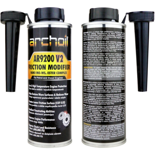 Archoil AR9200 V2 - to kompleksowy modyfikator tarcia, który został wykonany w syntetycznej technologii estrowej Molibdenu & Nano Dwusiarczku Wolframu (Mo-WS2). Najnowszej generacji kompleksowa technologia smarna, zapewnia zaawansowaną ochronę przeciwzużyciową oraz redukcję tarcia w silnikach benzynowych, wysokoprężnych i wyczynowych.Chroni silnik w ekstremalnie niskich i wysokich temperaturach pracyPomaga regenerować zużyte powierzchnie i chroni przed zużyciemTworzy powłokę o ultra niskim tarciu COF rzędu 0,03Wyjątkowa odporność na szokowe obciążenia ponad 5,000,000 PSIWyśmienite właściwości penetracyjne i antykorozyjnePoprawia osiągi silnikaNawet 15x lepsza ochrona od poprzedniej wersji nano WS2Estrowa technologia High PerformanceAR9200 V2 penetruje i pomaga regenerować zużyte powierzchnie a nowy mikronowej grubości film smarny o ultra niskim tarciu rzędu COF 0,03 zabezpiecza przed zużyciem, utlenianiem oraz korozją.AR9200 V2 można stosować w każdym czterosuwowym silniku benzynowym oraz wysokoprężnym, także z bezpośrednim wtryskiem paliwa, z turbosprężarką, filtrem cząstek stałych (DPF) czy trójfunkcyjnym konwerterem katalitycznym (TWC).AR9200 V2 może być dodawany do oleju silnikowego każdej klasy lepkości i jakości, mineralnego jak i syntetycznego o niskim, średnim lub pełnym poziomie popiołów (SAPS).Instrukcja stosowania:Zalecane dawkowanie: 40ml na 1 litr oleju silnikowego.Jedna butelka 200ml może być stosowana do 4,5 – 5,5 litra oleju silnikowego.Wstrząsnąć kilkukrotnie przed użyciem.Rozgrzać silnik do normalnej temperatury pracy i wyłączyć.Dodać produkt do oleju silnikowego i uruchomić silnik na 15 minut.Pojemność: 200 ml