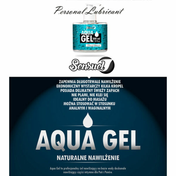 Sensuel - Aqua Gel Żel Poślizgowy. Najlepsza cena za najlepszą objętość 300 ml!Żel intymny na bazie wody, zapewniający lepszy poślizg. Idealny dla par. Posiada miły, lekko miętowy zapach. Zapomnij o suchości i otarciach. Żel wspaniale nawilży pochwę zapewniając idealnypoślizg!Sensuel Aqua Gel:- dla kobiet i dla mężczyzn,- można stosować również do zabaw analnych,- nie zostawia tłustych śladów,- jedwabista konsystencja- super poślizg,- doskonale nawilża,- łatwa aplikacja,- duża wydajność.Pojemność:300 ml.Sensuel to linia kosmetyków erotycznych, która powstała z myślą o francuskim rynku i wymagających klientach. Markata współpracuje z najlepszymi laboratoriami kosmetycznymiw Europie, gwarantując najwyższą jakość oferowanych produktów.