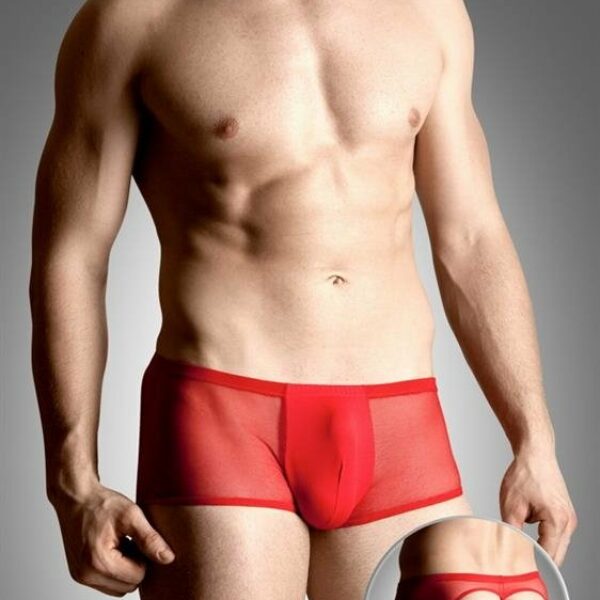 Szorty z motywem serca. Pozornie niewinnie wyglądające bokserki, wykonane z połączenia przezroczystej siateczki i miękkiego materiału. Tył stanowią dwa rozcięcia układające się na wzór serca uroczo wyglądającego na męskich pośladkach. Dostępne w dwóch kolorach czerwonym i czarnym.Rozmiar: XL