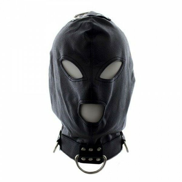 Toyz 4 Lovers - Bondage Hook Mask and Collar BLACK. Czarna maska niewoli z otworami na oczy i kołnierzem.