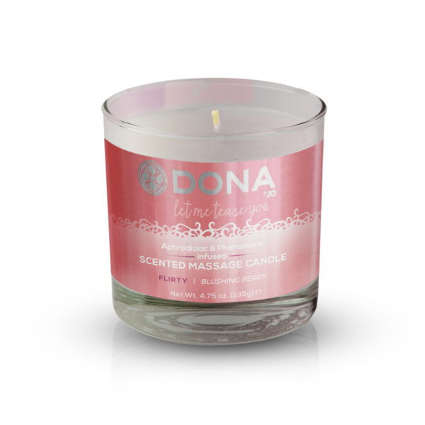 DONA - ZAPACHOWA ŚWIECA DO MASAŻU ZARUMIENIONA JAGODA 225 MLZapal zmysły świecą zapachową do masażu DONA. Pachnąca mieszanka afrodyzjaków i feromonów oraz nieodparty aromat sprawią, że roztopisz się pod wpływem swojego kochanka.Dona - Scented Massage Blushing Berry:- Zawiera feromony- W jej skład wchodzą zapachy uznawane za afrodyzjaki- Świeca sojowa uwalnia powoli aromaty- Luksusowy wosk do masażu