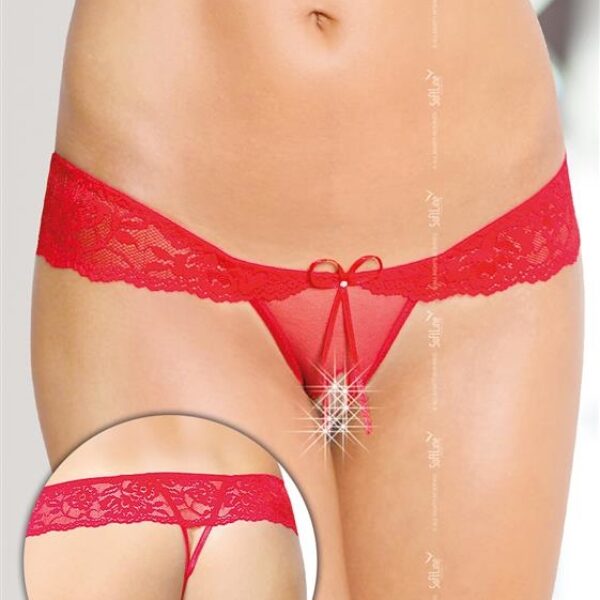 Koronkowe stringi z przodem z tiulu z ozdobną kokardką. Wycięcie w kroku. Kolor czerwony. Rozmiar S/M-Prać ręcznie w temperaturze 40 stopni.-Opakowanie: torebka foliowa i kartonik z nadrukiem-Rozmiar uniwersalny-Uroczy wygląd-energetyczny czerwony kolor-delikatna kokardka- otwarte kroczeProducent Softline, wyprodukowano w Polsce.