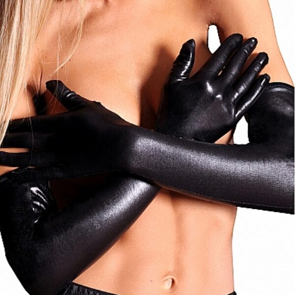 7Heaven - Long Wetlook Gloves. Długie rękawiczki poliestrowe z lateksowym połyskiem. S/M