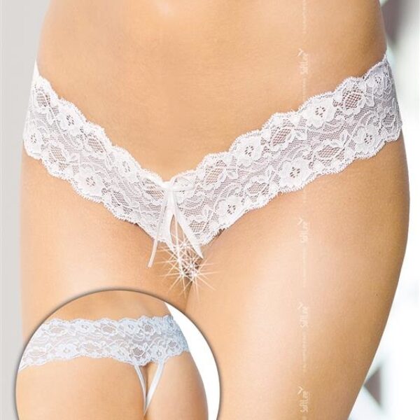 Softline - G-String 2456 S/MKoronkowe stringi damskie typu open crotch. Udekorowane delikatną, białą koronką.Tył z rozstawem dwóch paseczków zachodzących na pupę.Skład surowcowy: 97% Poliester 3% ElastanKolor: BiałyRozmiar S/M-Prać ręcznie w temperaturze 40 stopni.-Opakowanie: torebka foliowa i kartonik z nadrukiem-Rozmiar uniwersalny-Uroczy wygląd-w kolorze białym-delikatna biała koronka-otwarte kroczeProducent Softline, wyprodukowano w Polsce.