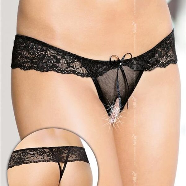 Softline - Thongs 2443 Black S/MKoronkowe stringi z przodem z tiulu z ozdobną kokardką. Otwarte krocze. Kolor czarny. Rozmiar S/M- Prać ręcznie w temperaturze 40 stopni.- Opakowanie: torebka foliowa i kartonik z nadrukiem- Rozmiar uniwersalny- Uroczy wygląd- wycięcie z przodu- czarna koronka- otwarte kroczeProducent Softline, wyprodukowano w Polsce.