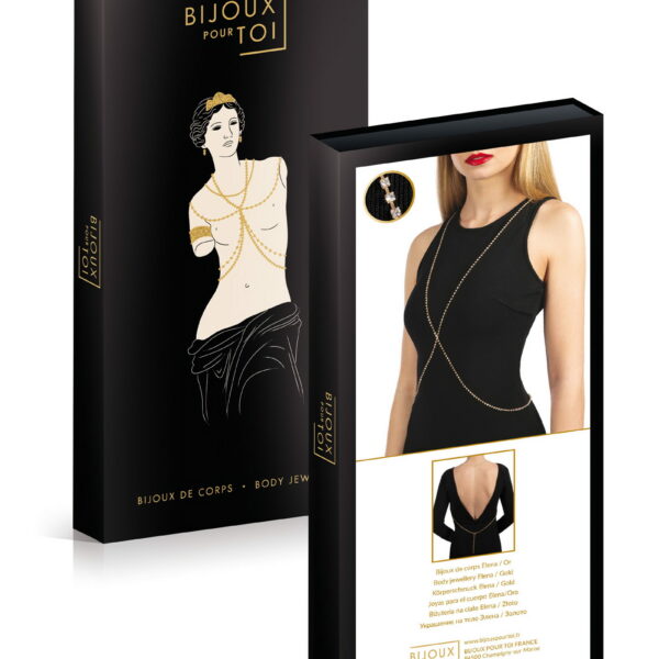 Złota Biżuteria z Diamentami podkreślająca biust i plecy.Elegancka biżuteria nadająca się na wieczorną kolację lub jako dodatek do seksownej bielizny.- do noszenia z bielizną, eleganckim strojem wizytowym lub nago...- ekskluzywny design,- biżuteria zapakowana w eleganckie czarne etui,- biżuteria doskonała na prezent- dbałość o wykonanie i wykończenie naszyjnika,- możliwość regulacji naszyjnika.Wymiary:220 x 110 x 25 mmKolor: Złoty