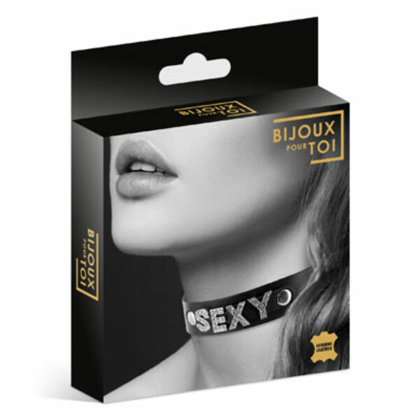 Bijoux Pour Toi Collier Strass Sexy Cuir. Naszyjnik Sexy SM.Seria biżuterii z eko skóry. Czarny naszyjnik z napisem "Sexy" idealny do podkręcenia erotycznej atmosfery.Zapinany na klipsy.Możesz nosić go jak biżuterie lub jak obroże w zależności od Twoich fantazji.