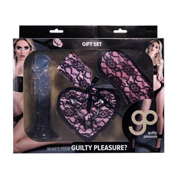 Zestaw Guilty Pleasure z kolekcji BDSM. W skład zestawu wchodzi:- Dildo - Pas Strap On - Opaska na oczy - Packa Zestaw jest wyjątkowo elegancki, a wyróżnia go: - solidny- możliwość przypięcia innego dildo do strap onu - miękka maska do oczu, która sprawia wrażenie satynowej na skórze,- ciekawy design - modny kolor przydymiony róż z czarną koronką, - giętkie dildo ma 19 cm długości i średnicę 4 cm - o-ring mocowany jest za pomocą 3 zatrzasków, które ułatwiają zakładanie i zdejmowanie dildo- 15 cm długości packa Idealne na prezent, luksusowy zestaw dla partnera!Sex shopAtrakcyjne zestawy