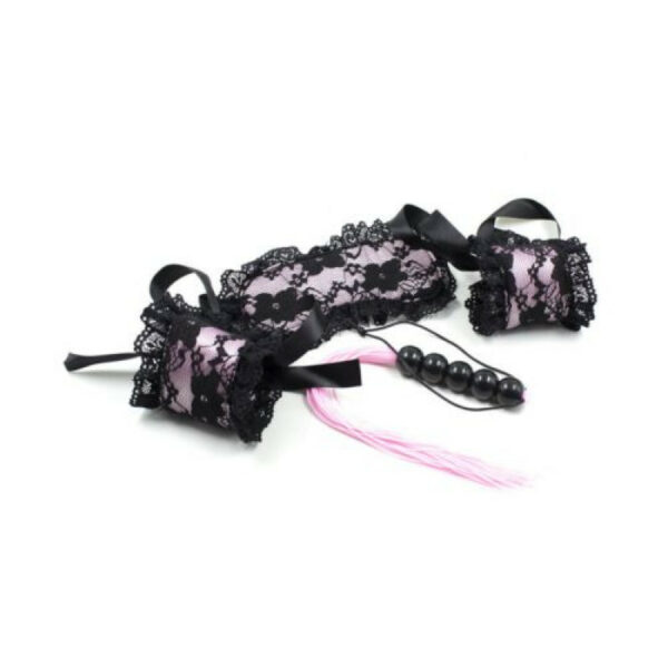 Fetish Art - Lace bondage kit. Różowy koronkowy elegancki zestaw do krępowania z pejczykiem.