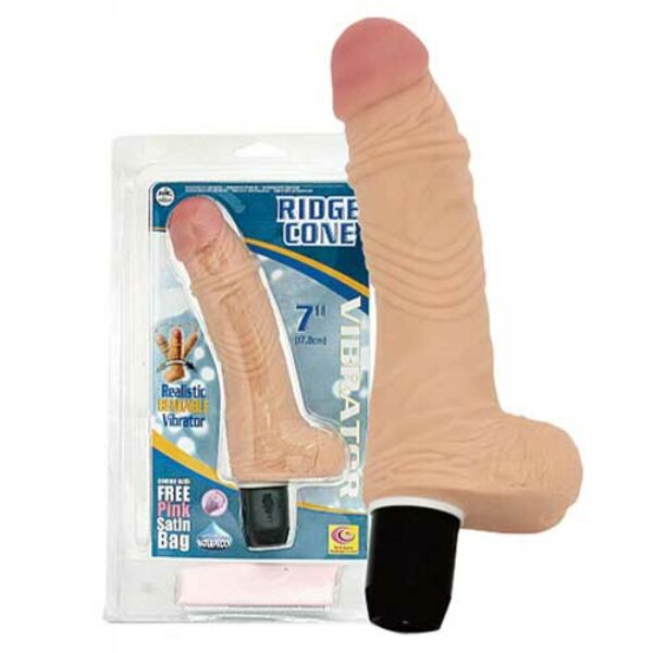 Ridge Cone to bardzo realistyczny wibrator, zachowujący wszystkie szczegóły anatomiczne. Wykonany jest z miękkiego w dotyku materiału. Całość łatwo się wygina, więc dostosowuje się do ciała. Ridge Cone wyróżnia się prążkowaną powierzchnią, zapewniająca dodatkowe wrażenia. Ridge Cone: - prążki i marszczenia, dodatkowo stymulujące, - wygina się, - posiada bardzo realistyczny kształt, w tym jądra, żyły, - posiada płynną regulację wibracji, - materiał bezpieczny dla ciała, - wodoodporny, - w różowy, satynowy woreczek do przechowywania. Wymiary: średnica ok. 4 cm. długość 17,8 cm. Kolor: naturalny. Zasilanie: trzy bateria AAA, do zakupienia osobno.SexshopSexshop Kraków