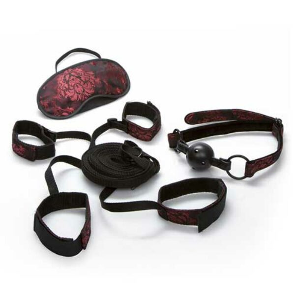 Zestaw zawiera:- miękką opaskę na oczy, na gumce,- knebel z otworami umożliwiającymi oddychanie,- uprząż z mankietami, do mocowania na łóżku.Scandal - Bed Restraint Kit:- zestaw trzyczęściowy,- mocny i solidny,- elegancki i gustowny,- regulowane zapięcie knebla,- mankiet zapinane na rzepy,- miękka, wygodna opaska na oczy,- pokryte eleganckim, kwiatowym wzorem,- zapakowane w efektowne tekturowe pudełko.Wymiary:długość opaski knebla 63,5 cm.średnica knebla 4,5 cm.długość mankietu 36,75 cm.długość pasków mocujących 363,25 cm. Nawet na bardzo duże łóżko.Materiał:65% poliester 35% elastanMetalowe elementy nie zawierają niklu.Kolor: czerń i czerwień.California Exotic Novelties jest największym, cenionym producentem akcesoriów dających rozkosz na świecie.Ich produkty są wyjątkowe i dzięki temu tak bardzo popularne wśród, nawet najbardziej wymagającychklientów. Kolekcja Scandal to produkty luksusowe, najwyższej jakości zaprojektowane w USA.