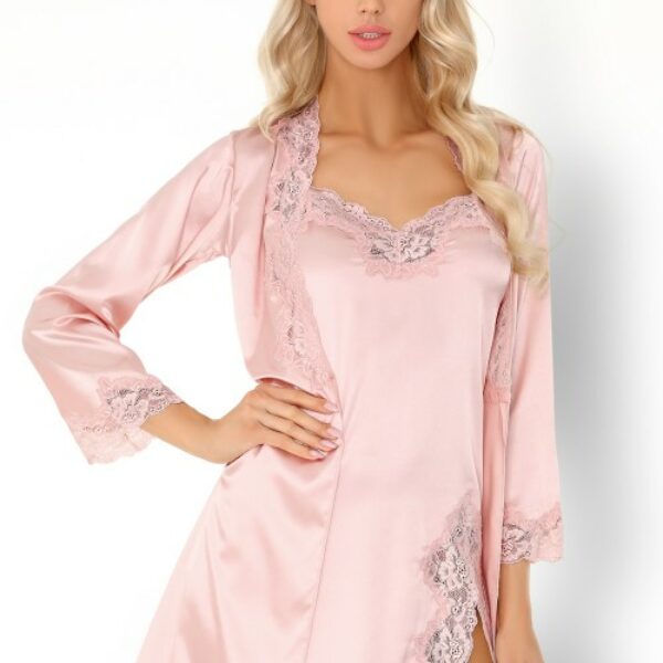 Niezwykle elegancki i kobiecy komplet bielizny z satyny w kolorze pudrowego różu. Koszulka na cienkich, regulowanych ramiączkach, której dekolt i rozcięcie z jednego boku ozdobiono misterną, jasnoróżową koronką. Przód i długie rękawy szlafroka wiązanego w talii paskiem, obszyte koronką .Długość kompletu sięga do połowy uda, w zestawie stringi.