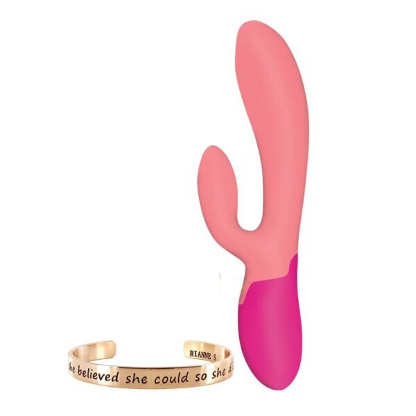 Rianne S - Xena Rabbit Vibrator to wykonany z silikonu wibrator ze stymulatorem łechtaczki.Posiada 10 różnych trybów oraz dosyć poręczny, ergonomiczny kształt.Ładowany przez USB.Do zestawu dołączona ozdobna bransoletka `she believed she could so she did`Specyfikacja:Waga: 178gPoziom głośności: <49 dBtryby wibracji: 10Czas działania:> 2 hoursWodoodporność: 100% (możliwość korzystania pod prysznicem, zaleca się unikanie zanurzania w wannie)Materiał: SilikonWymiary: 21cm x 4-6 cm x 4cmZasilanie: Ładowany przez USB