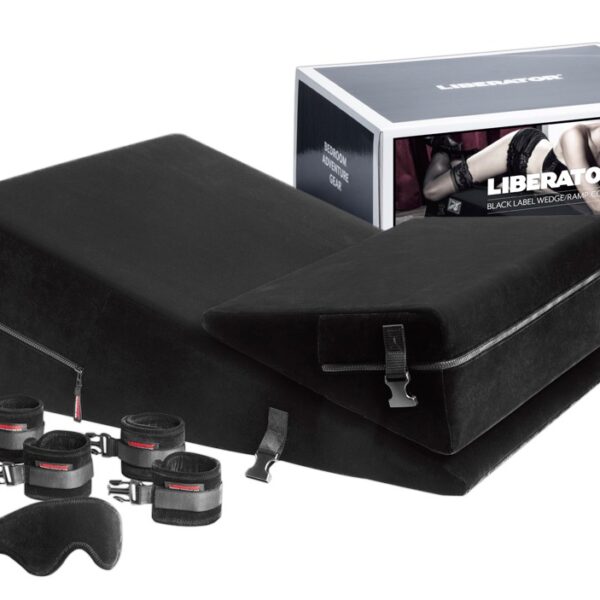 Absolute Passion Tip!Black love cushion (wedge and ramp combination) helps to create a stunning love scenery by setting positions and moves into the right angle. With clasps on the sides to link handcuffs. 4 piece cuff set (2x for hands/wrists and 2x for feet/ ankles, plus a belt) and 1 eye mask are included. The microfibre cover is machine washable. The 100% polyester inside lining keeps liquids outside the polyurethane foam core. Size: approx. W 61 x L 86 x H 30.5 cm.