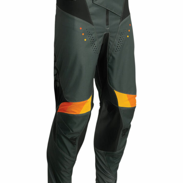 Spodnie cross Thor Pulse React wykonane są z wysokiej jakości materiałów zapewniających doskonałą mobilność oraz trwałość. Miejsca najbardziej narażone na zużycie wzmocnione zostały poliestrem 600D - materiałem o podwyższonej odporności na przetarcia. Wewnętrzna strona kolan zabezpieczona została licową skórą, która zapewnia optymalną przyczepność i trwałość. O solidnej konstrukcji spodni świadczą podwójne szwy na całej długości. Dzięki elastycznej tkaninie In-Motion możemy cieszyć się pełną swobodę ruchów. Spodnie wyposażone są w laserowo wycinane otwory wentylacyjne oraz meshowe panele na nogawkach, które gwarantują bardzo dobrą wymianę powietrza oraz efektywnie odprowadzają wilgoć. Proces ten wspomagany jest również przez oddychającą, wewnętrzną podszewkę. Idealne dopasowanie zapewnia podwójny system regulacji w pasie na rzep. Zaletą spodni są wyprofilowane kolana, które pozwalają przyjąć wygodną pozycję do jazdy. Spodnie cross kolorystycznie dopasowane są do dedykowanych bluz enduro z kolekcji Pulse.