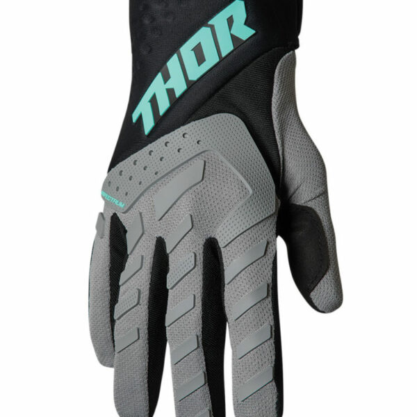 Thor Spectum to komfortowe rękawice przeznaczone do off-roadowej jazdy. Wykonane są z oddychających i elastycznych materiałów: siateczki mesh i Airprene, które zapewniają optymalny przepływ powietrza podczas jazdy. Gumowe protektory TPR na kostkach i palcach oraz wkładki z formowanej pianki świetnie osłaniają dłoń przed przetarciami i stłuczeniami. Końcówki palców (kciuk, palec środkowy i wskazujący) posiadają specjalne panele, dzięki którym można obsługiwać urządzenia z ekranem dotykowym w rękawicach. Lekka wyściółka dłoni gwarantuje pewny, komfortowy chwyt. Zapięcie na rzep w nadgarstku zabezpiecza rękawice crossowe przed zsunięciem się z dłoni. Dodatkowe wzmocnienia z materiału na kciuku oraz w punktach chwytu zwiększają żywotność rękawic.