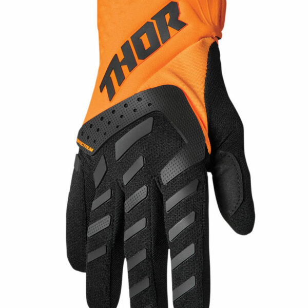 Thor Spectum to komfortowe rękawice przeznaczone do off-roadowej jazdy. Wykonane są z oddychających i elastycznych materiałów: siateczki mesh i Airprene, które zapewniają optymalny przepływ powietrza podczas jazdy. Gumowe protektory TPR na kostkach i palcach oraz wkładki z formowanej pianki świetnie osłaniają dłoń przed przetarciami i stłuczeniami. Końcówki palców (kciuk, palec środkowy i wskazujący) posiadają  specjalne panele, dzięki którym można obsługiwać urządzenia z ekranem dotykowym w rękawicach. Lekka wyściółka dłoni gwarantuje pewny, komfortowy chwyt. Zapięcie na rzep w nadgarstku zabezpiecza rękawice crossowe przed zsunięciem się z dłoni. Dodatkowe wzmocnienia z materiału na kciuku oraz w punktach chwytu zwiększają żywotność rękawic.