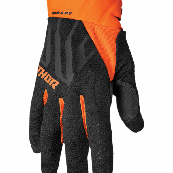 Rękawice cross Thor Draft zapewniają idealne dopasowanie i wyczucie kierownicy. Oddychająca i rozciągliwa w czterech kierunkach tkanina mesh gwarantuje świetną wentylację oraz pełną swobodę ruchu. Jednowarstwowa dłoń z zamszu AX Suede® pozwala na doskonałe wyczucie osprzętu motocykla. Dodatkowo posiada ona perforację, która zwiększa przepływ powietrza. Dla lepszej kontroli dźwigni końcówki palców pokryto silikonem. Rękawice posiadają formowany mankiet z biopianki, który zapewnia lekkość i bezpieczne dopasowanie. Ząbkowany otwór na nadgarstek zapewnia łatwy dostęp, a zapięcie na rzep solidnie utrzymuje rękawice na dłoni.