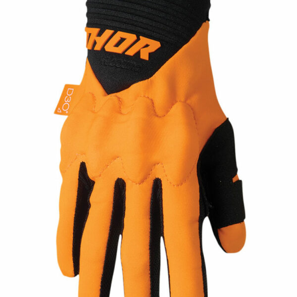 Rękawice cross Thor Rebound zapewniają wysoki komfort i bardzo dobrą ochronę podczas jazdy. Wierzch rękawicy wykonany jest z bardzo elastycznej i oddychającej tkaniny Airprene, a spód z perforowanego materiału Clarino. Zastosowanie tych materiałów sprawiło, że powstał produkt zapewniający doskonałą mobilność, bardzo dobrą przyczepność i świetne wyczucie kierownicy. W celu zwiększenia przepływu powietrza między palcami umieszczono przewiewne, meshowe panele. Rękawice wyposażone są w miękkie ochraniacze kostek D3O, które pod wpływem nagłego uderzenia twardnieją i pochłaniają jego energię. Producent wzmocnił również kciuk dodatkową warstwą materiału. Mocne zapięcie na rzep w nadgarstku bezpiecznie utrzymuje rękawicę na dłoni. Rękawice posiadają na palcach specjalne panele, które pozwalają na obsługę ekranów dotykowych bez ich ściągania.