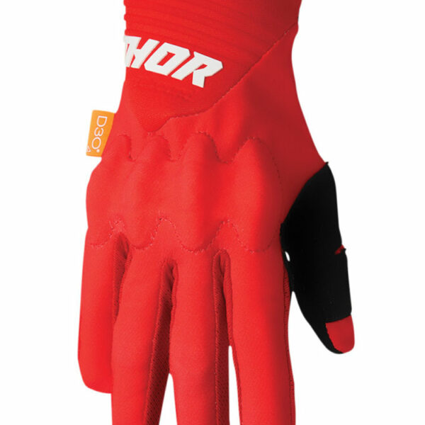 Rękawice cross Thor Rebound zapewniają wysoki komfort i bardzo dobrą ochronę podczas jazdy. Wierzch rękawicy wykonany jest z bardzo elastycznej i oddychającej tkaniny Airprene, a spód z perforowanego materiału Clarino. Zastosowanie tych materiałów sprawiło, że powstał produkt zapewniający doskonałą mobilność, bardzo dobrą przyczepność i świetne wyczucie kierownicy. W celu zwiększenia przepływu powietrza między palcami umieszczono przewiewne, meshowe panele. Rękawice wyposażone są w miękkie ochraniacze kostek D3O, które pod wpływem nagłego uderzenia twardnieją i pochłaniają jego energię. Producent wzmocnił również kciuk dodatkową warstwą materiału. Mocne zapięcie na rzep w nadgarstku bezpiecznie utrzymuje rękawicę na dłoni. Rękawice posiadają na palcach specjalne panele, które pozwalają na obsługę ekranów dotykowych bez ich ściągania.