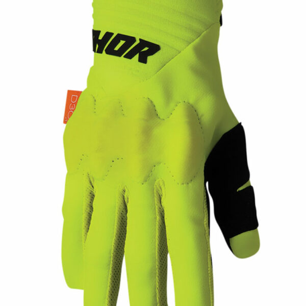 Rękawice cross Thor Rebound zapewniają wysoki komfort i bardzo dobrą ochronę podczas jazdy. Wierzch rękawicy wykonany jest z bardzo elastycznej i oddychającej tkaniny Airprene, a spód z perforowanego materiału Clarino. Zastosowanie tych materiałów sprawiło, że powstał produkt zapewniający doskonałą mobilność, bardzo dobrą przyczepność i świetne wyczucie kierownicy. W celu zwiększenia przepływu powietrza między palcami umieszczono przewiewne, meshowe panele. Rękawice wyposażone są w miękkie ochraniacze kostek D3O, które pod wpływem nagłego uderzenia twardnieją i pochłaniają jego energię. Producent wzmocnił również kciuk dodatkową warstwą materiału. Mocne zapięcie na rzep w nadgarstku bezpiecznie utrzymuje rękawicę na dłoni. Rękawice posiadają na palcach specjalne panele, które pozwalają na obsługę ekranów dotykowych bez ich ściągania.