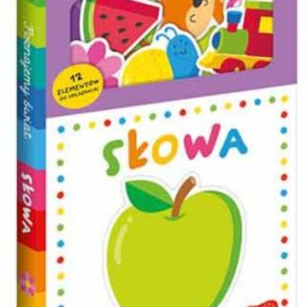 Idealny zestaw dla maluchów. W pudełku znajduje się książeczka ucząca pierwszych słów. Każda rozkładówka przedstawia wyrazy dotyczące jednej tematyki: np. owoce. Dodatkowo dzieci muszą dopasować puzzle do miejsc na stronie, co jest świetną zabawą, a dodatkowo utrwala słówka.