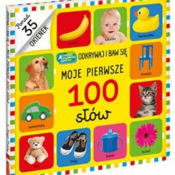 Książka „Moje pierwsze 100 słów” przedstawia podstawowe wyrazy: przedmioty w domu, kolory, posiłki. Słowem to, co w zasięgu wzroku i dłoni malucha. 50 otwieranych okienek rozwija dziecięcą motorykę i pamięć.