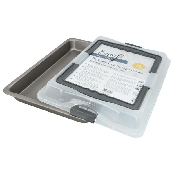 Forma do pieczenia z plastikową pokrywą do bezpiecznego przenoszenia ciasta. Forma pochodzi z kolekcji Basic Baking firmy Birkmann, wykonana jest z wytrzymałej stali pokrytej warstwą nieprzywierającej powłoki. Odporność temperaturowa wynosi do 230 stopni C. Myć ręcznie.