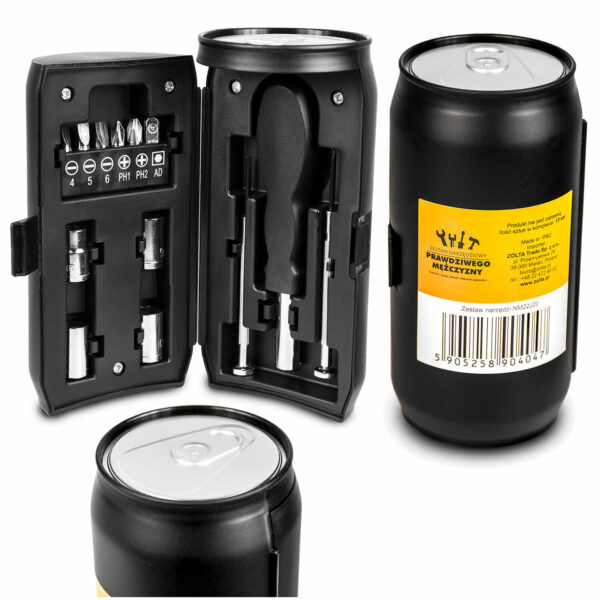 ZESTAW NARZĘDZI PUSZKA ORYGINALNY PREZENT UPOMINEK ✔️Wymiary: długość: 7 cm wysokość: 14,4 cm szerokość: 7,3 cm ✔️Zestaw zawiera aż 13 elementów! 2szt. wkrętaków precyzyjnych uchwyt do bitów i nasadek zestaw 6 bitów (płaskie, krzyżaki i torxy) 4 końcówki nasadowe ⭕ Cechy produktu: ✔️ pomysłowy wzór - nieczęsto się zdarza, by majsterkowicz miał tak kreatywny pojemnik na narzędzia. Etui jako puszka z pewnością zadowoli każdą "złotą rączkę”. Estetycznie zapakowane narzędzia, to podstawa każdego mężczyzny. ✔️ dbałość o detale - każdy szczegół zestawu był wykonany z największą starannością. ✔️ praktyczny i poręczny - aż 13 elementy! Tyle mieści się do naszej skrzynki narzędziowej! ⭕Zestaw narzędzi, który zapakowany jest w pomysłowe etui w postaci puszki, to z pewnością trafiony prezent dla każdego mężczyzny. Praktyczny i nowatorski upominek spełni oczekiwania każdego majsterkowicza. ⭕ Oryginalny prezent, który podbije serca każdego mężczyzny. Ucieszy zarówno Twojego faceta jak i dziadka czy tatę. ⭕ Ten zestaw narzędzi będzie świetnie prezentował się na warsztatowej półce każdego majsterkowicza! ⭕ Czego trzeba więcej dla prawdziwego faceta? Zestawu narzędzi zapakowanego w ciekawą skrzynkę. Przemyślane etui jest pojemne i mieści najbardziej potrzebne narzędzia.