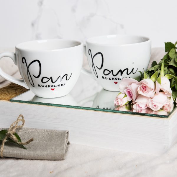 Nadzwyczajny, zestaw porcelanowych kubków XL z napisem - Pan i Pani z Twoim nazwiskiem