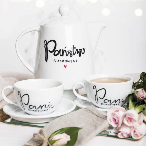 Nadzwyczajny, porcelanowy zestaw ślubny - Zestaw: Dzbanek Państwo z nazwiskiem + filiżanki Pan/Pani z nazwiskiem