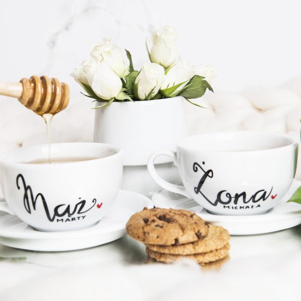 Nadzwyczajny, zestaw porcelanowych filiżanek z napisem - Żona, Mąż z imionami
