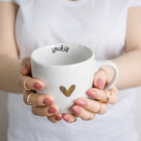 Nadzwyczajny, porcelanowy kubek z napisem - złote serduszko "Spokój"