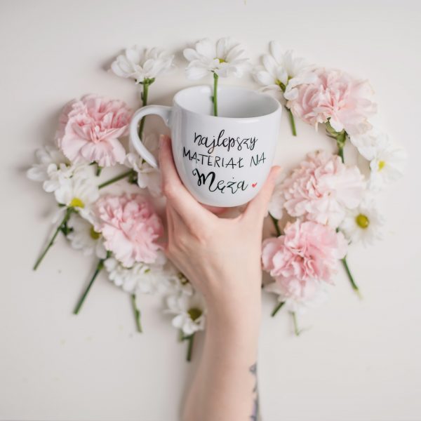 Nadzwyczajny, porcelanowy kubek z napisem - Najlepszy materiał na męża